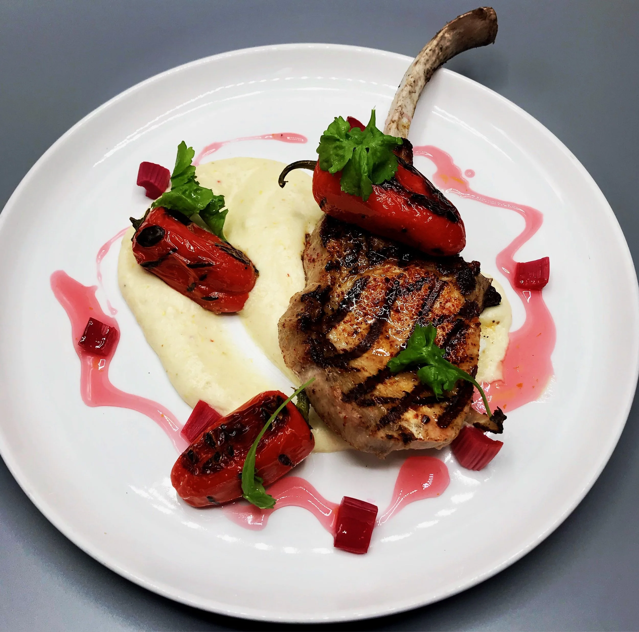 Niman Ranch Pork chop, rhubarb gastrique, white corn grits, charred gypsy peppers