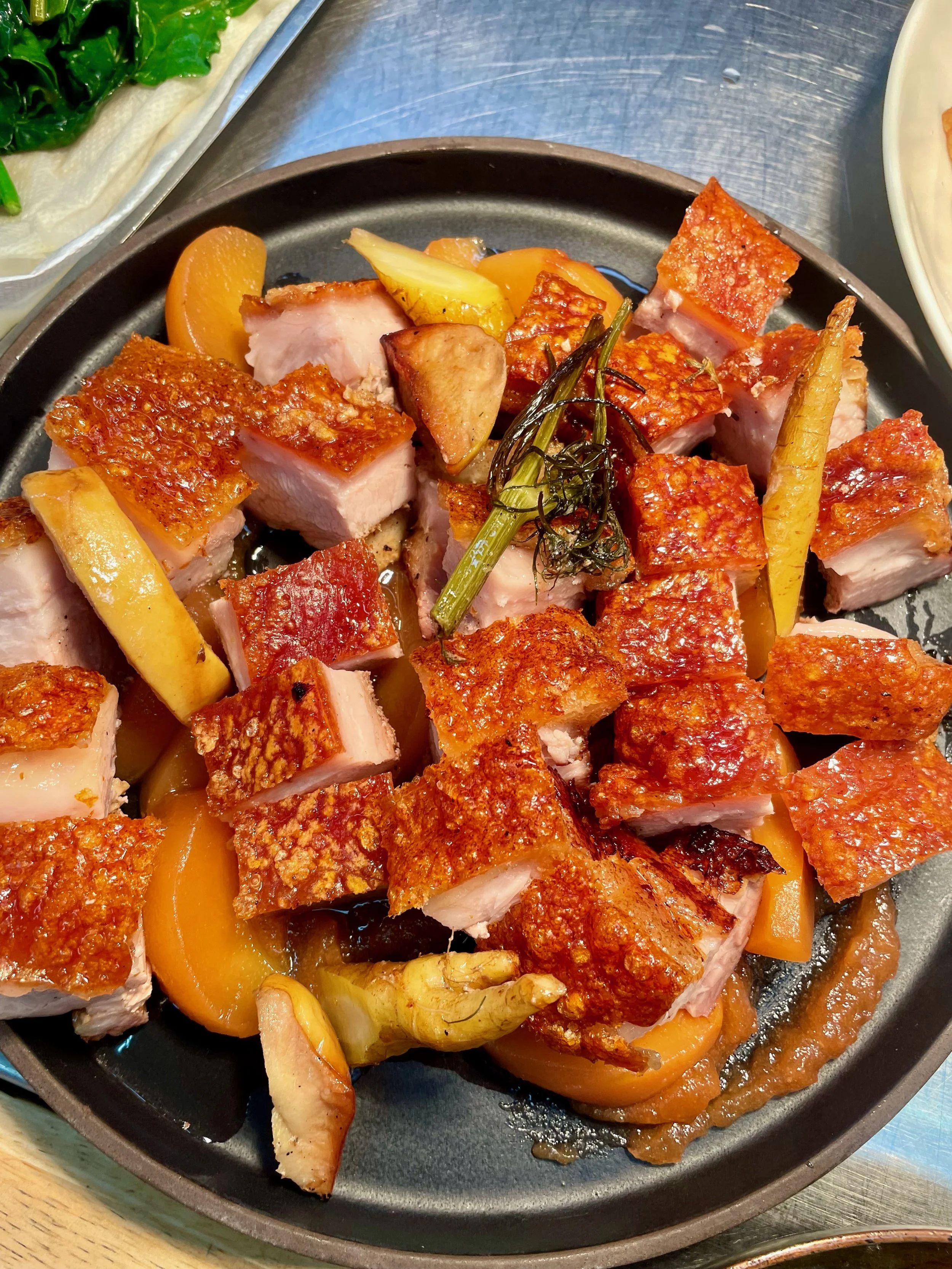 super-crispy skin pork belly, braised quince, buddha's hand, fennel