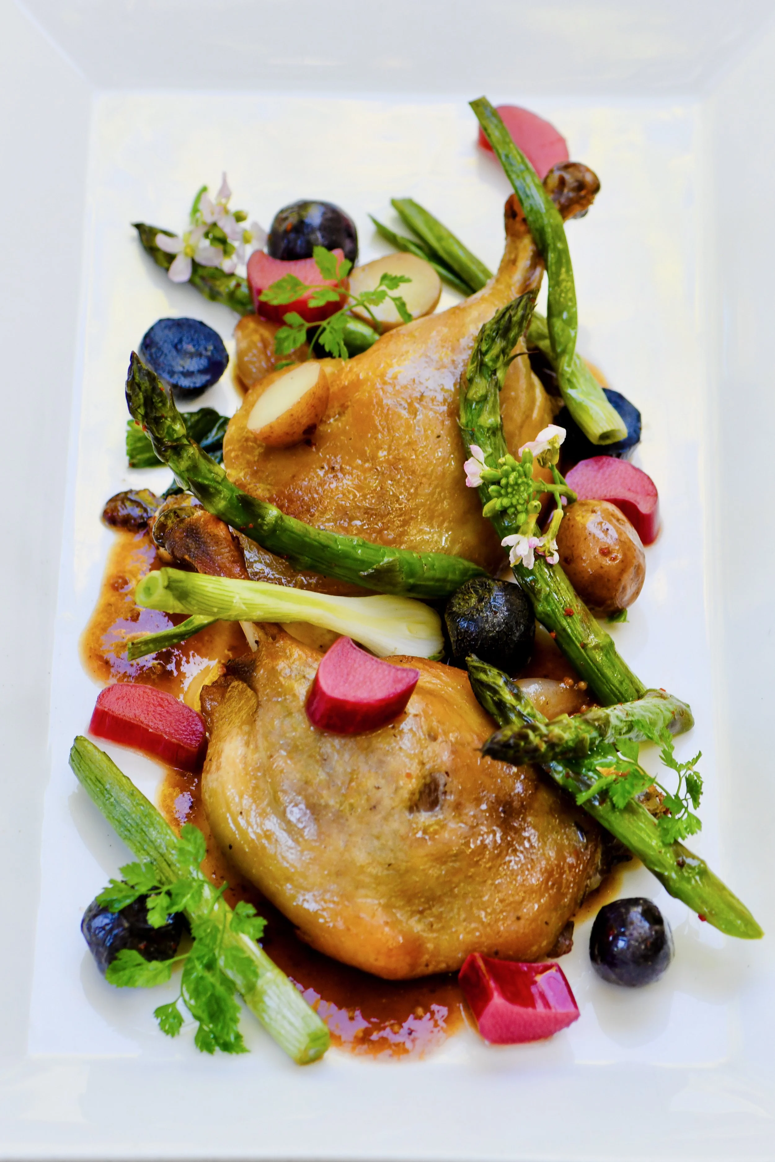 Grimaud duck leg confit, rhubarb, baby potatoes, spring onions, grilled asparagus, preserved fig jus