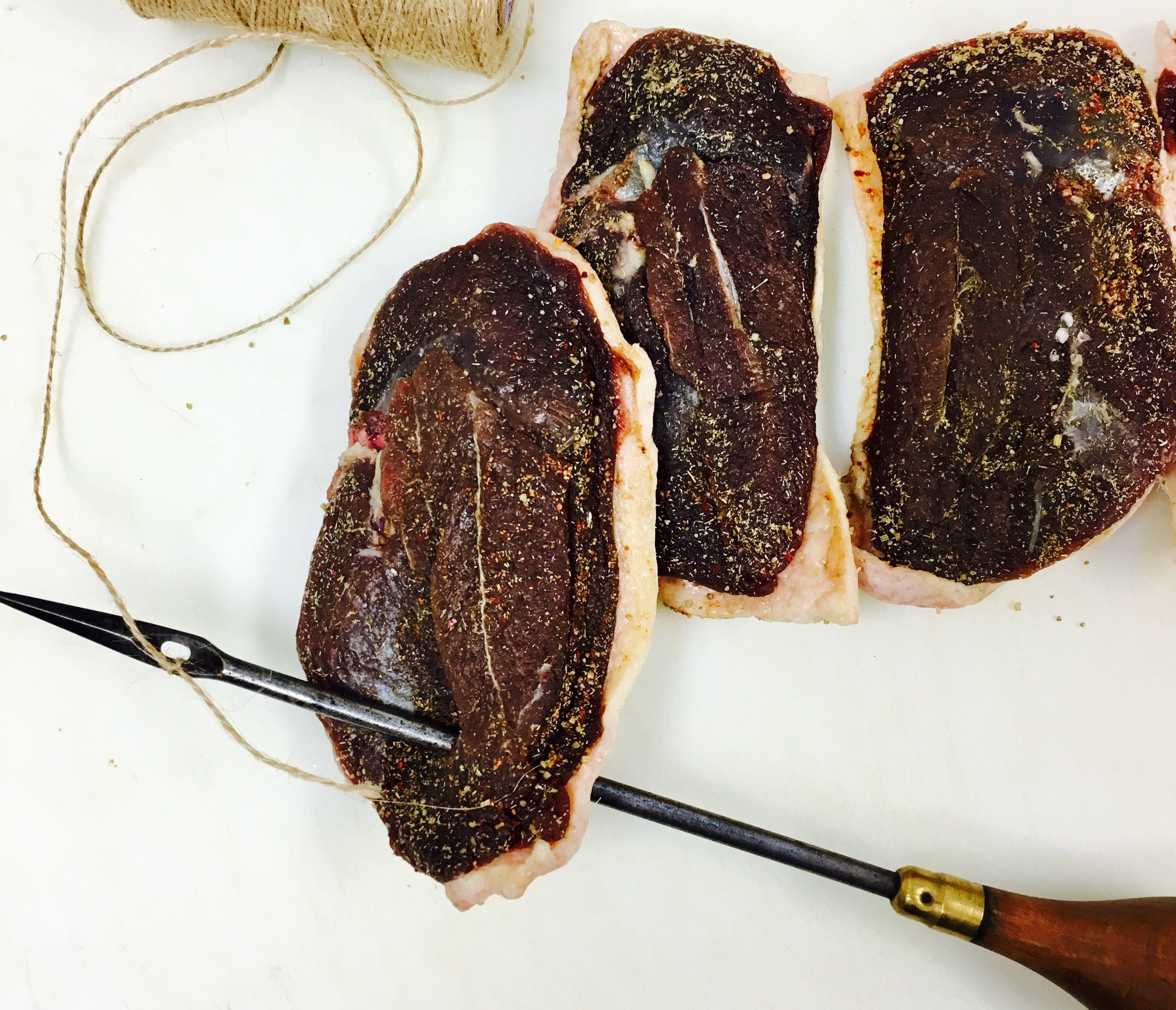 Duck breast, fennel seed & coriander cure, pimentón rub, getting ready to hang and dry